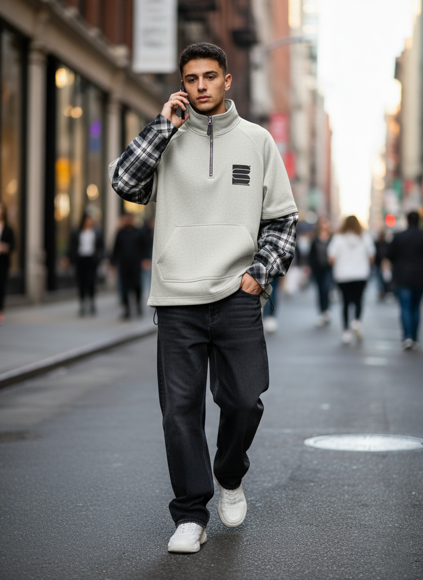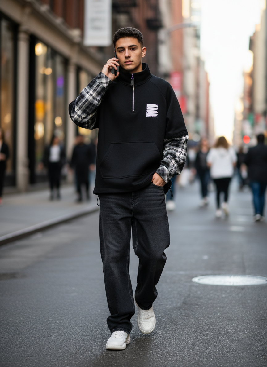 Уникальный крой: Классический черный или серый верх с высоким воротником на молнии дополнен стильными рукавами из клетчатой ткани. Это смелое сочетание создает многослойный эффект и придает толстовке неповторимый вид.